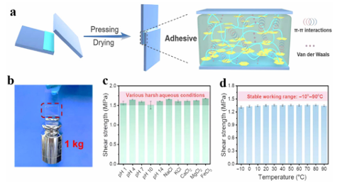 Fig. 11 The lasting adhesion in various harsh environments according to the adhesion characteristics of different substrates. (a) P(DPOP-Si) adhesion with p–p and van der Waals interactions. (b) Photograph of the glass surface P(DPOP-Si) adhesive. (c) Adhesive stability of P(DPOP-Si) adhesive after 7 d of immersion in various solutions at pH 1–14 and different salt solutions (NaCl, KCl, CaCl2, MgCl2, and FeCl3). (d) The relationship between the shear bond strength of the adhesive and working temperature.43 Reproduced from ref. 43 with permission from American Chemical Society.