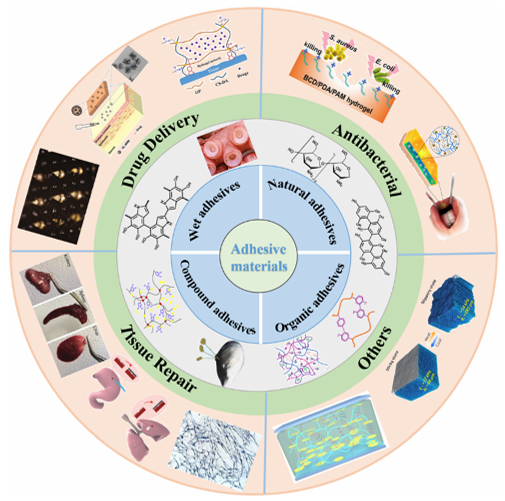 Anadhesive material can join two separated substances together and prevent their separation. As one of the most important auxiliary materials, traditional adhesive materials have been   widely used in a variety of industrial production and manufacturing processes, including, but not limited to, packaging operations, automotive manufacturing, and industrial coating or fillers. Their application in the biomedical field is very important. They are widely used in biomedicine due to their unique adhesion, biocompatibility, and excellent surface properties. Biomedical adhesives can be divided into external and internal adhesives according to their applications in the human body.