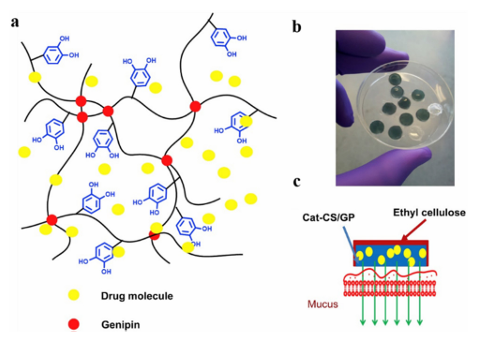 Fig. 4 Cat-CS/GP hydrogel: (a) schematic representation of the Cat-CS hydrogel network comprised of GP crosslinking. (b) Cat-CS/GP hydrogel with ethyl cellulose protective cap. (c) Schematic representation of drug release from encapsulation in the hydrogel on the mucosal surface. Reproduced from ref. 33 with permission from Elsevier.