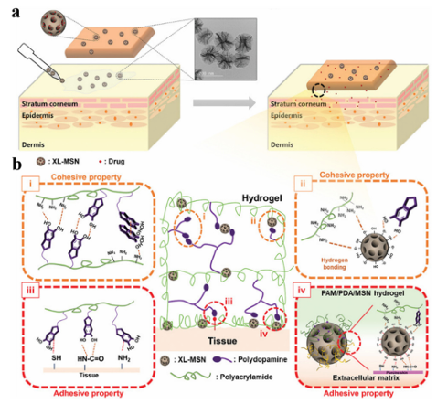 For the adhesion of hydrogels to the skin surface, Kim et al. proposed a tissue adhesive hydrogel comprised of a polyacrylamide/polydopamine (PAM/PDA) hydrogel embedded with super-macroporous mesoporous silicon dioxide NPs (XLMSN). Due to the adhesion of XL-MSN at the interface, the application of XL-MSN at the hydrogel-skin interface can further enhance the adhesion (Fig. 1). They loaded the model drug into a patch-embedded XL-MSN and used the resulting hydrogel patch to demonstrate transdermal drug delivery through pig skin. The results show that this approach is simple and effective for the transdermal delivery of adhesive hydrogel patches that can enhance the strength and adhesion to skin.