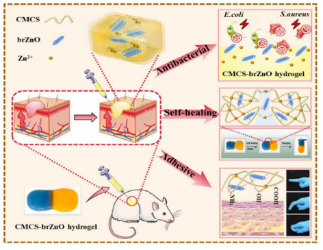 Jiang et al. reported an injectable multifunctional hydrogel that was synthesized via the incorporation of spindle-shaped zinc oxide nanorods into carboxymethyl CS (CMCS-brZNO) (Fig. 8). Hydrogels have the advantages of controllable gel time, rapid hemostasis, and good tissue adhesion. In addition, the CMCS-brZnO hydrogel exhibited low minimum inhibitory concentrations (MIC) against Escherichia coli (0.0125 mg mL 1) and Staphylococcus aureus (0.025 mg mL 1), and excellent antibacterial activity. In a full-thickness skin defect experiment, the hydrogel can be directly injected into the wound with an irregular shape and exhibited excellent adhesion to the skin model; the good fitting of the gel to the wound geometry as well as the slow and sustained release of antibacterial Zn2+ significantly promote wound healing and reduce the inflammatory response. These attractive properties give the CMCS-brZnO hydrogel great potential for clinical applications.