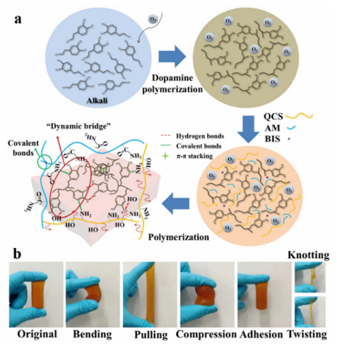Excellent adhesive performance is required in the field of intelligent devices. Hydrogels are materials that contain a lot of water, which can provide a transport pathway for conductive ions, and are promising candidates for the manufacture of artificial skin and strain sensors. Most elastomers, which consist of semiconductors and metals, detach from each other under large strain, resulting in the breakdown of the conductive network and loss of conductive stability and sensing properties. Hydrogels with excellent adhesion properties ensure that the   electrical signals are converted to the maximum extent possible during application.
