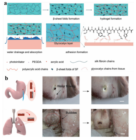 Adhesives that can bind strongly to biological tissues have a broad range of application prospects. In general, strong binding with biological tissue adhesives has a certain degree of biological toxicity. However, Li et al. designed a strong tissue adhesive with a two-layer matrix that was less biologically toxic inspired by the defensive mucus secreted by Mollusca slugs. Theadhesivewas a bionic design comprised of two layers of matrix: adhesive surface and dissipation matrix. The former was attached to the substrate via electrostatic interactions, covalent bonds, and physical interpenetration, and the latter by the hysteresis amplification of energy dissipation. The interaction of the two substrates further enhanced the adhesive ability to adhere to wet surfaces, resulting in a tight bond with pig skin, cartilage, heart, arteries, and liver. It has been reported that this adhesive has successfully achieved the rapid repair of perforated heart tissue in pigs and liver tissue in rats. Therefore, this bionic approach effectively reconciles the issues of tissue adhesion and biotoxicity.