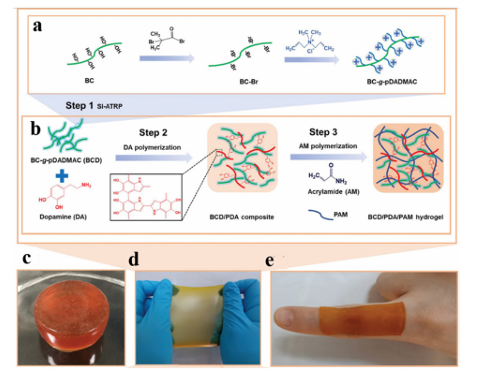 Wu et al. reported the synthesis of cationic polyelectrolyte brushes grafted with bacterial cellulose (BC) nanofibers in polyacrylamide hydrogels. The PAM component has good biocompatibility and a stable cross-linked structure, so it can be used as ahydrogel scaffold, while the PDA component is rich in 1,2-dihydroxybenzene groups, has good adhesion performance, and can be attached to various surfaces. In particular, there is a need for large-scale movement of particular areas   (Fig. 5). More importantly, the nanofiber (BCD) component not only has a rigid BC backbone to enhance the mechanical properties of the hydrogel, but also has a poly(diallyl dimethyl ammonium chloride) (pDADMAC) brush with a broad spectrum of low-toxicity positively charged quaternary ammonium groups, which can provide efficient and durable antibacterial properties. Therefore, the BCD/PDA/PAM hydrogel has excellent mechanical properties, stable adhesion, and long-lasting antibacterial activity, which can be used for antibacterial wound healing in particular areas requiring extensive exercise.