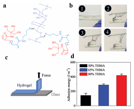 Fig. 2 (a) A schematic representation of p(APMA-co-THMA) cross-linked with dexamethasone (Dex)-CHO used to form a biodegradable adhesive hydrogel. (b) The adhesive properties of the hydrogel between two glass slides. (c) A schematic representation of the peeling test. (d) Average adhesion of hydrogels prepared with different THMA contents to a glass slide.39 Reproduced from ref. 39 with permission from American Chemical Society.