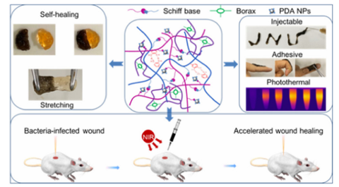 Organic synthetic adhesive materials can be cross-linked by dynamic bonds, showing sufficient mechanical strength and flexibility that can accommodate wound movement at the same time exhibiting an antibacterial effect, thus accelerating wound healing. Pan et al. proposed a novel supramolecular gelatin (GT) hydrogel comprised of a GT-grafted aniline tetramer and quaternary-ammonium CS. The hydrogel was cross-linked using monoaldehyde b-cyclodextrin via host–guest interactions and a dynamic Schiff base. Due to its dynamic properties, the hydrogel exhibits flexibility, self-healing, and tissue adhesion, and is well suited to athletic wounds. The hydrogel has shown antibacterial, antioxidant, and hemostatic properties in sports wound healing experiments with full-thickness Staphylococcus aureus (MRSA) infection and has great potential for wound healing.