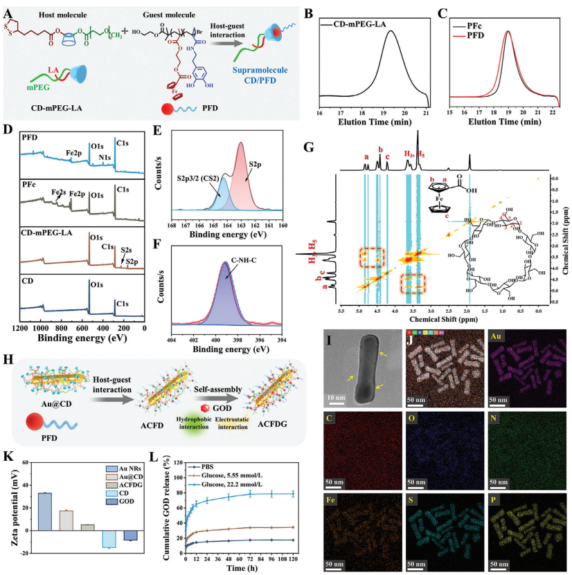 Figure 1. A) Schematic illustration for the preparation of supramolecule Polymers of CD/PFD. SEC elution traces of B) CD-mPEG-LA and C) PFc and PFD using DMF as an eluent. D) XPS analysis of host-guest polymers. E) The S2p core-level spectra of CD-mPEG-LA. F) The N core-level spectra of PFD. G)2D NOESY NMR spectra of CD/PFD in DMSO-d6. H) Schematic illustration for the preparation of ACFDG. I) TEM images of ACFDG. J) HAADF-STEM image of ACFDG and corresponding EDX elemental mapping images of Au, C, O, N, Fe, S, and P, respectively. K) Zeta potential of Au NRs, Au@CD,ACFDG, CD, and GOD, and L) the adaptable cumulative release curve of GOD in ACFDG at different media. Composite photothermic agents are the key to realizing a deep PDT/PTT synergistic therapy. Gold nanomaterials and polydopamine materials are currently one of the most renowned photothermal agents in clinical trials for PTT. Self-adaptive hyperthermia ACFDG was formulated by loading GOD through a combination of hydrogen bonding, electrostatic, and hydrophobic interactions (Figure 1H). The specific steps are as follows: 1)Au NRs with uniform particle size were synthesized by a typicalseed-mediated growth method (Figure S11, Supporting Information), and the transmission electron microscopy (TEM) images of Au NRs showed good dispersion (Figure S12a, Supporting Information); 2) CD-mPEG-LA polymers were conjugated to Au NRsby Au─S bonds (denoted as Au@CD). Compared with Au NRs,TEM images and element distribution of Au@CD clearly show the distributions of Au, C, O, and S elements, which fully confirm the successful preparation of Au@CD (Figures S12b and S13, Supporting Information); 3) GOD, as the core part, forms the final hyperthermia supramolecular cascade reactor ACFDGby coassembly with ACFD. The final morphology of ACFDG was characterized by TEM (Figure 1I; Figure S14, Supporting Information), which intuitively confirmed its rod-like structurein ACFDG. Elemental mapping of Au, C, O, N, S, Fe, and P (Pcomes from flavin adenine dinucleotide in GOD) in ACFDG indicated that GOD was successfully loaded into the supramolecular assembly, in which the loading efficiency of GOD is 22.9%(Figure 1J; Figure S15, Supporting Information). The UV–visspectra of Au NRs, Au@CD, and ACFDG are shown in Figure S16a (Supporting Information). The absorption peak of pure AuNRs is ≈790 nm. After modification by CD, the absorption peak redshifts to 810 nm; however, after loading with GOD, the absorption peak redshifts again and is finally fixed at 837 nm. At the same time, the particle diameter was evaluated using dynamic light scattering (DLS) (Figure S16b, Supporting Information). The final hydrodynamic particle size increased from 36.7 nm of Au NRs to 230 nm of ACFDG, confirming the self-assembly behavior. In addition, the above results were confirmed by the change in zeta potential values (Figure 1K). These results collectively confirm the successful fabrication of the adaptive hyperthermia ACFDG by host-guest interaction-induced self-assembly. As the rational behavior of in vitro drug release is critical for ensuring the safety and efficacy of drug usage, hence, ACFDG was dispersed in PBS solutions of different glucose concentrations to simulate the normal and diabetic microenvironments (Figure 1L). Compared to pure PBS, GOD showed significant glucose-triggered release behavior upon exposure to glucose, with the release rate being glucose concentration-dependent. At high glucose concentration (22.2 mmol L?1, the diabetic microenvironment), GOD released 78% within the initial 3 days, while GOD released only 34% at 5.55 mmol L?1. Further fitting the invitro drug release curve of GOD, we found that the release kinetics of ACFDG in different release media were highly consistent with the Korsmeyer-Peppas release model with the highest correlation coefficient (R2 ≥ 0.99) (Table S3 and Figure S17, Supporting Information). In conclusion, the adaptive release behavior of GOD is beneficial for matching local glucose concentration to reduce the accumulation of by-products caused by excessive releaseof GOD, and instrumental to anti-inflammatory and antioxidant properties in vivo. 2.2. ACFDG Supramolecular Cascade Reaction and In Vitro Antioxidant Properties The successful preparation of supramolecular ACFDG encourages us to systematically investigate its catalytic functions. Among the many modalities of glucose regulation, the classical GOD catalyzes glucose oxidation, possessing the intrinsic potential to reduce focal glucose concentration, and demonstrating twin-engine powered the rapeutic effects on diabetes. Recently, it has been found that GOD and catalase (CAT) cantrigger a cascade reaction, accelerating the decrease in glucose concentration. As illustrated in Figure 2A, the catalytic glucose and oxygen by Au NRs and GOD in the supramolecular cascade reaction process produces gluconic acid and H2O2, alleviating the high-glucose microenvironment. The intermediate product H2O2 further undergoes a Fenton-like reaction with hydrophobic ferrocene to produce ·OH. Under the presence of H2O2, horseradish peroxidase (HRP) can catalyze the color development of substrates 3,3′,5,5′-tetramethylbenzidine (TMB), and can be qualitatively detected by naked-eye discrimination (Figure 2B). UV–vis absorption spectroscopy also shows that the uncolored TMB can be immediately oxidized to blue oxidation of TMB (oxTMB) by ·OH generated by the cascade reaction, resulting in a strong absorption peak at 652 nm. Interestingly, ACFDG showed pH-dependent peroxidase-like activity, with no absorption peak observed under no glucose at pH 4.7 and with glucose at pH 7.4, respectively, indicating that ACFDG cannot catalyze the occurrence of cascade reactions for neither condition. When both weak acid and glucose are present simultaneously, a strong absorption peak appears at 652 nm, suggesting that ACFDG can only undergo a cascade reaction by both glucose substrate and weak