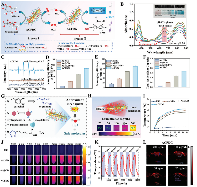 Figure 2. Cascade reaction, antioxidant, photothermal, and photoacoustic properties of ACFDG. A) Schematic illustration of ACFDG nanoconfinement supramolecular cascade reaction. B) UV–vis absorption spectra of the catalyzed oxTMB with a supramolecular cascade reactor in the different reaction systems (red arrow: pH 4.7, no glucose; gray arrow: pH 7.4, with glucose). C) EPR spectra of ·OH produced by the cascade reaction of the supramolecular assembly under different conditions. D) The DPPH-scavenging, E) ·OH scavenging, and F) the total antioxidant capacity of Au NRs, Au@CD,Au@CD/PFc, and ACFDG. G) Schematic diagram of ACFDG for ROS scavenging mechanism. H) Final temperature infrared thermal images of ACFDGat different concentrations. I) Temperature profiles of PBS, Au NRs, Au@CD, and ACFDG solutions with the same concentration of 100 μg/mL. J) Thermal imaging of PBS, Au NRs, Au@CD, and ACFDG solutions after 15 min laser irradiation. K) Temperature profiles of ACFDG with six repeated“heating/cooling” NIR irradiation. L) PA images of ACFDG at different concentrations (25, 50, 100, and 200 μg mL?1, respectively). The imbalance of periodontal homeostasis is associated with over expression of ROS, leading to chronic inflammatory diseases. Additionally, the rapid removal of glucose catalyzed by the cascade reaction may lead to the accumulation of H2O2, resulting in excessive ROS and limiting the application of GOD. Consequently, how to effectively reduce glucose concentration and timely and effectively eliminate by-products such as ·OH generated by GOD catalysis and H2O2 induced by DM has become the main goal in the treatment of inflammatory disease. DPPH is a typical molecule for evaluating the antioxidant activity of biomaterials. Figure S18a (Supporting Information) provides the DPPH detection mechanism. The purple DPPH solution turns yellow after being treated with ACFDG (Figure S18b,Supporting Information), and the UV–vis absorbance at 517 nm becomes weaker (Figure S18c, Supporting Information). As depicted in Figure 2D, the DPPH scavenging ability of ACFDG is as high as 90%, which is 9.14 times that of Au NRs. ·OH scavenging ability is also a commonly used indicator for evaluating antioxidant performance. It was observed that ·OH scavenging ratio of ACFDG at 100 μg mL?1 was 89%, which was higher than that of Au NRs (16%), Au@CD (37%) and Au@CD/PFc (67%)(Figure 2E). The mimicking activity of CAT mainly scavenges H2O2 as well as produces non-toxic O2 and H2O. UV–vis absorption at 415 nm was significantly lower than that of AuNRs and Au@CD (Figure S19a, Supporting Information), and the H2O2 scavenging ratio of ACFDG could reach up to 84%, which was 5.25, 2.33 and 1.25 times than that of Au NRs (16%),Au@CD (36%) and Au@CD/PFc (67%), respectively (FigureS19b, Supporting Information). Finally, the total antioxidant capacity of ACFDG was evaluated using the FRAP assay, and ACFDG reached 0.176 (Figure 2F; Figure S20, Supporting Information). Interestingly, the scavenging effect of DPPH, ·OH, and H2O2 was consistent with the trend of total antioxidant capacity, indicating that multiple functions of ACFDG synergistically promoted ROS scavenging. Above all, a summary was made on the ROS scavenging mechanism, as illustrated in Figure 2G,1) the function of phenolic hydroxyl groups. On the one hand,the phenolic hydroxyl groups of PDMA are partially preserved after self-polymerization, enabling chelation with cellular metalions and consequently inhibiting enzyme activity. On the otherhand, the phenolic hydroxyl groups have reductivity, promoting the conversion of catechol to o-quinone, thereby demonstrating broad-spectrum ROS scavenging ability; 2) the function of ferrocene. Ferrocene can react with hydrogen peroxide to produce a compound with antioxidant activity, thus scavenging ROS; 3) the function of polysaccharides. The multi-hydroxyl structures in polysaccharides can react with free radicals, neutralizing their activity; 4) the function of LA. As a natural antioxidant, LA possesses strong nucleophilic and free radical reaction ability due to its disulfide pentacyclic structure, which can directly scavenge ROS; LA can also play an antioxidant role in vivo and in vitro by chelating transition-state metal ions. Through the afore mentioned experiments, we have confirmed that ACFDG can respond to local glucose concentration and catalyze glucoseto produce gluconic acid and H2O2 through the continuous release of GOD, thus alleviating the hyperglycemic environment. It has also been confirmed that ACFDG can effectively scavenge harmful substances generated by GOD catalysis and induced by DM, further catalyze the secondary product of GOD to generate oxygen, ameliorate hypoxia and solve the side effects of H2O2 accumulation, and effectively alleviate inflammation. 2.3. Photothermal and Photoacoustic Properties of ACFDG Arising from the photothermal conversion ability of Au NRs andDMA, ACFDG can produce heat under 808 nm laser irradiation (Figure S21a, Supporting Information). Under NIR irradiation,the heating rate of ACFDG is positively correlated with their radiation power density between 0.3 to 1.25 W cm?2 (FiguresS21b and S22a, Supporting Information). The concentration of ACFDG solution also influences the photothermal properties, the photothermal curve of ACFDG solution presents a time-dependent and concentration-dependent tendency, as shown in Figure S21c (Supporting Information). The temperature thermal imaging of each sample with different concentrations after 15 min of NIR irradiation is presented in Figure 2H. The images intuitively demonstrate that ACFDG has a good photothermal effect, yet high irradiation power densities (1.0 and 1.25 W cm?2) and high concentrations will lead to excessive temperature (>45 °C), thereby adversely affecting cell viability and metabolism, such as decreased cell viability, apoptosis, and overexpression of inflammation. Studies have indicated that