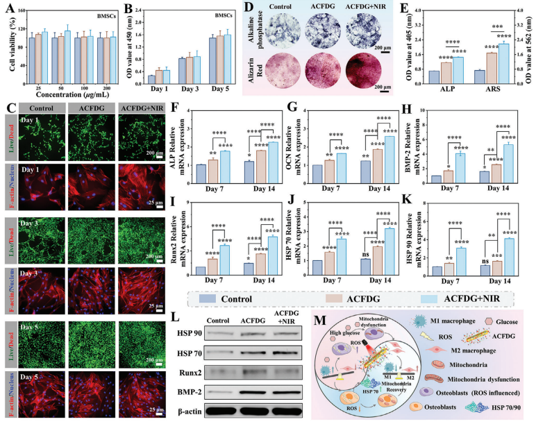 Figure 4. In vitro biocompatibility and osteogenic potential in hyperglycemic microenvironment. A) Cytotoxicity of ACFDG in BMSCs cells within 24 h. B) BMSCs proliferation with different groups co-cultured for 1, 3, and 5 days. C) Representative fluorescence images displaying Live/Dead staining assay and cell morphology of BMSCs at days 1, 3, and 5. D) Post-osteogenic differentiation ALP staining after 7 days and ARS after 21 days. E) Quantitative analysis of ALP and ARS. Relative mRNA expression levels of osteogenic gene F) ALP, G) OCN, H) BMP-2, I) Runx2 and heat shock protein J) HSP 70, K)HSP 90 in BMSCs were analyzed by qRT-PCR (n = 3, *p <0.05, **p < 0.01, ***p < 0.001, and ****p < 0.0001 when compared with control, *p < 0.05, **p< 0.01, ***p < 0.001, and ****p < 0.0001 suggests statistical difference between other groups, ns p > 0.05 implies that there is no significant difference). L) Representative WB images of BMP-2, Runx2, HSP 70, and HSP 90 and M) Schematic illustration of hyperthermia ACFDG breaking the vicious cyclein the diabetic microenvironment and achieving bone regeneration. 2.5. In Vitro Studies of Osteogenesis Mild hyperthermia has been proven beneficial for bone regeneration.[15e,f] The BMSCs were co-cultured with different groups to assess the effects of hyperthermia ACFDG on them, including cell viability and osteogenic differentiation potential. CCK-8 assays and live/dead staining were used to detect the effects of various groups on the cell viability of BMSCs at 1, 3,and 5 days. CCK-8 results revealed that cells treated with different groups had good viability and significant proliferation activity (Figure 4A; Figure S29, Supporting Information). Live/deadstaining showed that all groups of cells exhibited strong green fluorescence (live cells) from day 1 to day 5, consistent with CCK-8 results, and the cell number significantly increased with incubation time, suggesting that the ACFDG+NIR did not show side effects on cell proliferation (Figure 4B,C; Figure S30, Supporting Information). Meanwhile, all groups of cells exhibited spindlelike morphology, whose nucleus (blue staining) and cytoskeleton (red staining) were identified (Figure 4C; Figure S30, Supporting Information). Given the essential role of bone regeneration in the treatment of periodontal bone resorption and defects, ACFDGco-cultured BMSCs cells were used to evaluate the osteogenic potential in vitro. Alkaline phosphatase (ALP) serves as a typical biomarker of osteogenic differentiation and Alizarin Red S (ARS)is a renowned marker for identifying the formation of mineralized nodules and, thus both are adopted for the evaluation of bone generation. ALP staining and ALP activity determination after 4 and 7 days of culture showed that the staining level in the ACFDG group was significantly higher than that in the control group, and the staining effect was further improved after NIR treatment, which was also confirmed by ALP activity level (Figure 4D,E; Figure S31, Supporting Information). It was worth noting that the ARS activity of the ACFDG+NIR group was the highest at 14and 21 days (Figure 4D,E; Figure S32, Supporting Information). Quantitative analysis revealed that the OD values of ARS and ALP activities in the ACFDG+NIR group were 3.0 and 2.1 times higher than those in the control group, respectively, which confirmed the NIR-treated hyperthermia supramolecules ACFDG has excellent osteogenic differentiation properties. Besides, the expression of BMSCs osteogenic genes and proteins was measured under NIR stimulation. QRT-PCR showed that the expression of bone formation-related genes including ALP, osteocalcin (OCN), bone morphogenetic protein 2 (BMP-2), and Runtrelated transcription factor 2 (Runx2) showed similar variation at both 7 and 14 days (Figure 4F–I). Notably, the relative expression values of ACFDG+NIR genes remained the highest, suggesting that hyperthermia supramolecules ACFDG can significantly promote osteogenic differentiation. The WB analysis also confirmed similar results (Figure 4L). Notably, the ACFDG group exhibited stronger osteogenic potential than the control group, which is mainly attributed to the synergistic anti-inflammatory and antioxidant effects of the supramolecular cascade system. In summary, the ACFDG has excellent osteogenic differentiation potential invitro, which paves the way for further in vivo experiments. The heat shock proteins HSP 70 and HSP 90 are related to the heat tolerance of osteoblasts, thus closely related toosteogenesis.[15c,f,g] PTT-induced HSPs have been widely used in the treatment of cancer and some bone-related diseases, but the application of diabetic periodontal bone regeneration has rarely been reported. To elucidate the effect of PTT-induced osteogenesis, we validated the expression of HSP 70 and HSP 90 under NIR irradiation by qRT-PCR (Figure 4J,K). The relative expressions of HSP 70 and HSP 90 in ACFDG+NIR group were significantly up-regulated on day 7 and day 14, while the expression of ACFDG was relatively weak. WB analysis also showed that ACFDG+NIR successfully activated the heat shock response of BMSCs with high expression of HSP 70 and HSP 90 (Figure 4L). To sum up, NIR-assisted ACFDG can activate heat shock protein, inhibitin flammation, increase the expression of osteogenic genes and proteins, and participate in osteogenic differentiation and bone metabolism. The potential signaling pathways of ACFDG, which break the vicious cycle of excess ROS and inflammation in the diabetic microenvironment, remodel mitochondrial dysfunction,up-regulate heat shock protein expression, and achieve diabeticbone regeneration, are established in Figure 4M. 2.6. In Vivo Bone Formation and Anti-Inflammatory Ability of ACFDG The aforementioned in vitro experimental results collectively indicate that the hyperthermia supramolecular ACFDG not only directly promotes bone formation through anti-inflammation, reversal of mitochondrial dysfunction, and up-re