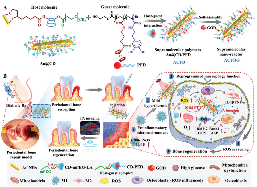 Photoacoustic Imaging-Guided Self-Adaptive Hyperthermia Supramolecular Cascade Nano-Reactor for Diabetic Periodontal Bone RegenerationIssuing time:2025-02-21 14:25 Miao Zhang, Xu Peng, Hong Xu, Xiaoning Sun, Yizhu Liu, Qian Li, Yuan Ding,Shaopei Ding, Jun Luo, Jing Xie, and Jianshu Lee 1. Introduction Diabetes mellitus (DM) is a metabolic disease characterized by chronic hyper glycemia and chronic inflammation that typically involves immune tolerance breakdown, local inflammation, and tissue destruction, gradually leading to systemic chronic disorders and disability. According to the International Diabetes Federation, the number of diabetes patients worldwide has reached 540 million in 2022. Diabetes-related complications, such as renal, neurological, and cardiovascular disorders, impose a significant threat to human health and place a tremendous burden on healthcare systems. Among them, diabetic bone defects have received extensive attention, which mainly presents as bone loss, an increased risk of bone defects (such as alveolar bone resorption, skull defects, fibular defects, etc.), and difficult healing characteristics. The increasing prevalence of diabetic bone disease poses significant challenges to clinical specialties, particularly orthopedics and dentistry. Taking oral bone defects as an example, the number of patients experiencing tooth loss due to periodontal bone resorption caused by diabetes has been gradually increasing in recent years. Studies have shown that diabetic patients have an average of 11.4% more missing teeth than non-diabetic individuals. Indiabetic patients, the increase of advanced glycation end products (AGEs) in periodontal tissues activates local immune and inflammatory responses, and induces the accumulation of reactive oxygen species (ROS), leading to the imbalance of periodontal homeostasis, which in turn inhibits periodontal bone formation and regeneration. Moreover, diabetes reduces the quantityof collagen in periodontal tissues by decreasing collagen synthesis and increasing collagen degradation. These factors collectively exacerbate the destruction of periodontal connective tissues and aggravate the loss of periodontal bone. It is noteworthy that there are currently no effective treatments for periodontal bone regeneration in diabetic patients, as the complicated periodontal local microenvironment (such as depth localization and monitoring of periodontal lesions, immunological microenvironment imbalance, etc.) poses significant challenges for periodontal treatment. Traditional therapeutic methods (including drug therapy and surgical treatment) have limited efficacy and long term and frequent medication can cause dose-related side effects, such as lung/liver damage and bone marrow suppression. Therefore, there is an urgent need for a personalized intervention system capable of targeting multiple pathogenic factors to completely address the complex diabetic periodontal bone regeneration issues. Macrocyclic compounds, combining the advantages of small molecules and topology, including well-defined structures, efficient recognition specificity, and high thermal and chemical stability, serve as exemplary supramolecular chemical carriers. Wherein, supramolecular agents, based on the dynamic reversible properties of host-guest interaction, are endowed with sensitive reactions to disease-specific microenvironment; Meanwhile, supramolecular chemistry has unique significance for photothermal materials, and the supramolecular assembly of molecular photothermal sensitivities enhances its heat generation and improves photothermal conversion efficiency. Hyperthermia pre-treatment can induce thermo-tolerance and has been shown to be protective against various types of injury. Mild photothermal NIR therapy has been proven to playa role in mid-to-late stages of bone healing and accelerated regeneration. Under NIR irradiation, hyperthermia promotes bone marrow stromal cell (BMSC) osteogenic differentiation and biomineralization by upregulating the expression of HSPs, blocking pro-inflammatory Nuclear factor-B (NF-B) cascade, and evoking autoimmune modulation, thereby accelerating bone regeneration. Furthermore, early diagnosis of diseases plays a crucial role in disease prevention and treatment. In recent years, PA imaging has gained significant attention as an emerging medical imaging modality due to its high penetration and high sensitivity. Notably, PA imaging can provide non-invasive monitoring of the distribution of nanomaterials in vivo and simultaneously detect blood oxygen saturation in living organisms. Up until now, in the treatment of diabetic periodontal bone regeneration, hyperthermia-induced HSPs expression remains rare, and its osteogenic signaling pathways are not yet clear, lacking effective real-time non-invasive diagnostics. Therefore, leveraging the advantages of photothermal therapy (PTT) and PA dual-modal imaging technology, designing a supramolecular photothermal nano-reactor with enhanced supramolecular photothermal effects may achieve precise personalized treatment for diabetic periodontal bone regeneration. Based on the features of the diabetes periodontal microenvironment and the superior features of supramolecular photothermal materials, we designed a novel immunomodulatoryand self-adaptive real-time monitoring system for diabetic periodontal bone regeneration for the first time. Gold nanorods (AuNRs) were conjugated with poly (ethylene glycol) methyl ether (mPEG) and lipoic acid (LA)-modified -cyclodextrin (-CD) asthe host molecule (denoted as Au@CD), linear functionalized ferrocene (PFD) acted as the guest molecule. The host-guest interaction between the cavity of -CD and ferrocene provided amphiphilic supramolecules, embedding glucose oxidase (GOD) through electrostatic interaction, obtained adaptive hyperthermia supramolecular cascade nano-reactor Au@CD/PFD@GOD(ACFDG). On one hand, in the hyperglycemic environment of diabetes, GOD can b