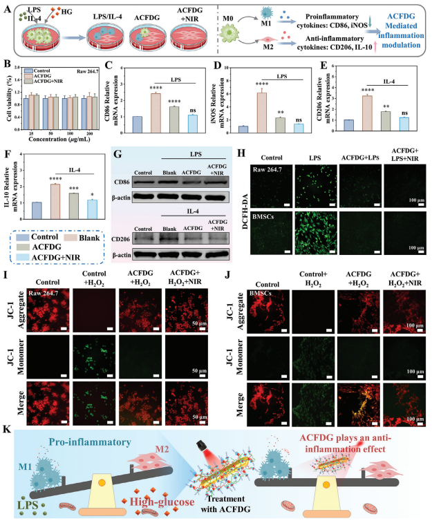 Figure 3. Evaluation of inflammatory immune microenvironment and mitochondrial dynamic in hyperglycemic microenvironment. A) Schematic representation of immune regulation of LPS/IL-4 and HG-induced macrophages by ACFDG. B) Cytotoxicity of ACFDG and ACFDG+NIR at different concentrations in Raw 264.7 within 5 days. qRT-PCR analysis shows the mRNA expression levels of C) CD86, D) iNOS, E) CD206, and F) IL-10 in the LPS andIL-4 treated Raw 264.7 (n = 3, *p < 0.05, **p < 0.01, ***p < 0.001, and ****p < 0.0001 indicate a significant difference in comparison with the control 2.4. Effects of ACFDG on Inflammation, ROS Scavenging and Mitochondrial Function through Immunomodulation Given that the favorable biocompatibility of biomaterials is aprerequisite for in vivo or clinical applications, we conducted initial assessments of the hemocompatibility and toxicity of different experimental groups. As shown in Figure S25 (Supporting Information), the hemolysis rate of the positive control group (pure water) is close to 100% (red solution). Compared with the negative control group of saline, all materials could not cause hemolysis, and the hemolysis rate is less than 5%, indicating good hemocompatibility of the materials. The toxicity results are shown in Figure 3B; Figures S26 and S27 (Supporting Information), the Au NRs, Au NRs+NIR, Au@CD, Au@CD+NIR, ACFDG, and ACFDG+NIR showed no cytotoxicity to Raw 264.7. Compared to the control group, all experimental groups exhibited cell viabilities exceeding 95%, indicating the ideal cytocompatibility of ACFDG, and appropriate NIR hyperthermia would not cause significant toxicity. Nevertheless, in the diabetic microenvironment, macrophages are in a pathological state, producing large amounts of pro-inflammatory cytokines that exacerbate the inflammatory microenvironment, which is closely related to the failure of bone regeneration. To explore the immunomodulatory inflammatory mechanism of hyperthermia ACFDG, the Raw264.7 cultured in high-glucose (HG) medium was stimulated with lipopolysaccharide (LPS) and interleukin-4 (IL-4) to imitate the inflammatory microenvironment of diabetes (Figure 3A). As revealed in Figure 3C–F, LPS and IL-4 could significant lypromote the secretion of M1 phenotype (CD86, inducible nitricoxide synthase (iNOS)) and M2 phenotype (CD206, interleukin10 (IL-10)) inflammation markers (p < 0.0001), while the content of inflammation markers in ACFDG and ACFDG+NIR groups was significantly down-regulated, demonstrating theanti-inflammatory property of ACFDG. After NIR treatment, the expression levels of M1 and M2 markers were even closer to thosein the control group (p > 0.05), indicating that ACFDG+NIR had more excellent reprogramming ability on macrophages. NF-Bserves as a crucial regulator of immunity, inflammation, and cell survival. ROS-associated redox regulation is pivotal for enhancing the activity of NF-B in both cytoplasmic and nucleus pathways. In turn, the secretion of pro-inflammatory factors induces ROS generation, which evolves into a vicious circle. Therefore,we also validated the effect of hyperthermia ACFDG on the activation of NF-B signaling pathway by qRT-PCR (LPS-treated Raw264.7). Compared with the control group, LPS stimulation activated the expression of inflammatory NF-B signaling, while the content of inflammation markers in ACFDG and ACFDG+NIRgroups was significantly down-regulated (Figure S28a, Supporting Information). The expression level of NF-B in hyperthermia ACFDG treatment was even closer to those in the control group (p> 0.05), indicating that hyperthermia ACFDG has excellent antiinflammatory effects. To further verify the anti-inflammatory effect of ACFDG, western blot (WB) analysis was performed on inflammation-related proteins (CD86 and CD206), and the results showed that the expression of inflammation-related proteins in the blank group (treated with LPS and IL-4) was higher than that in the control group, in which ACFDG can reduce the expression of inflammation-related proteins and ACFDG+NIRwas closer to that in the control group, and the anti-inflammatory effect is more significant, confirming that appropriate heat stimulation further inhibited inflammation (Figure 3G). Overall, qRT-PCR and WB results all testified that ACFDG+NIR exertedc ellular anti-inflammatory effects through the macrophage transformation from the pro-inflammatory phase (M1 phenotype) to the anti-inflammatory phase (M2 phenotype). As ROS overproduction is the main cause of periodontal inflammation and activation of macrophages, inflammation, and excessive ROS are mutually reinforcing cascades that lead to the aggravation of alveolar bone resorption. Therefore, inspired by the excellent ROS scavenging ability of ACFDG in vitro, we further investigated the cellular antioxidation performance of ACFDG and the effect of the hyperglycemic microenvironmenton excess ROS. The intracellular ROS fluorescent probe DCFHDA results revealed that ACFDG+NIR can effectively scavenge the overproduced ROS induced by LPS in Raw 264.7 and BMSCs cells, with no significant difference in ROS levels compared to the control group, suggesting that hyperthermia ACFDG plays an important role in ROS scavenging (Figure 3H). To explore the mechanism of intracellular ROS scavenging more deeply, the changes in mitochondrial function in the HG microenvironment were detected. Mitochondria are the organelles in cells responsible for producing energy, and the source of ROS-inducedcell damage. Therefore, a mitochondrial fluorescent stainingprobe (JC-1) was used to detect the intensity of the mitochondrial membrane. In general, when the mitochondrial membrane potential is at a high potential state, JC-1 will form a polymer with red fluorescence, and when the membrane potential is abnormal, it will form a green fluorescent monomer. As revealed in Figure 3I,J, strong red fluorescence in healthy cells can be observed, while H2O2 stimulation leads to a significant decrease i