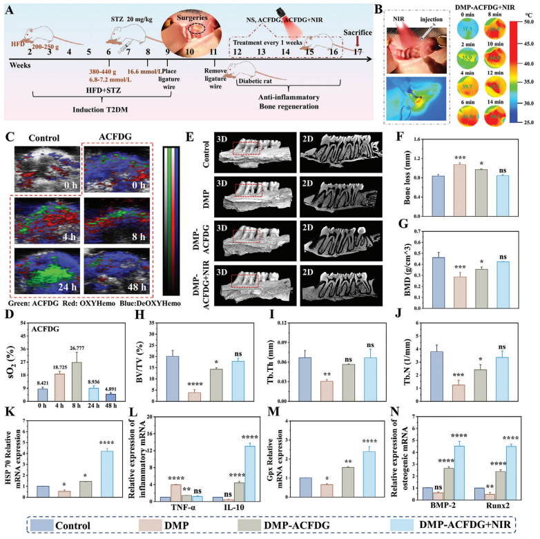 Figure 5. In vivo therapeutic effect of ACFDG on diabetic periodontal bone regeneration in rats. A) Schematic experimental schedule of diabetic periodontal bone repair model and treatment with ACFDG. B) Thermograms of periodontal heat production with NIR irradiation and temperature changes in the periodontal area after local injection of ACFDG (0, 2, 4, 6, 8, 10, 12, and 14 min). C) PA images of local injection of ACFDG periodontal tissue. D) Quantification of sO2 in the periodontal area. E) Micro-CT images of maxillary alveolar bone at the palatal side, treated under different experimental conditions. The left image in each group displays the 3D reconstruction image and the images on the right represent the bucco-palatal sagittal slices ofMicro-CT. F) Quantitative analysis of the distance between CEJ and ABC (Bone loss). The quantitative analysis of bone-related parameters: G) BMD, H)BV/TV, I) Tb.Th and J) Tb.N from the micro-CT images. qRT-PCR analysis of mRNA expression: including heat shock protein HSP 70 K), inflammatoryfactor: L) TNF- and IL-10, M) Gpx and osteogenic genes: N) BMP-2 and Runx2 (n = 3, *p < 0.05, **p < 0.01, ***p < 0.001, and ****p < 0.0001 whencompared with control, ns p > 0.05 implies that there is no significant difference). Hematoxylin and eosin (H&E) and Masson staining were used to evaluate the inflammatory status and periodontal bone regeneration in each group. As described in Figure 6A; Figure S36 (Supporting Information), inflammatory cells infiltrate in the DMP group, including neutrophils and macrophage aggregation, whereas the appearance of inflammatory cells was less in the other groups. Masson staining was used to detect collagen degradation at inflammatory sites in periodontal tissue (Figure 6B; Figure S36, Supporting Information). Most of the collagen fibers in the DMP group degraded (red staining), while the collagen fibrils in the ACFDG+NIR group were very similar to those in the control group, mostly dense and organized (blue staining), indicating that NIR hyperthermia ACFDG can effectively inhibit periodontal destruction. To evaluate the collagen fibers in periodontal new bone in detail, the collagen area of three different areas was calculated under the same magnification microscope. Compared to the DMP group, the collagen fiber area of each group increased to varying degrees, with the ACFDG+NIR group collagen area being closest to the control group (p > 0.05), confirming that hyperthermia ACFDG effectively promoted the maturation of new collagen fibers around the periodontal bone (Figure S37a, Supporting Information). As reported, interleukin-1 (IL-1) can stimulate gingival fibroblasts to degrade collagen, while also releasing and activating various matrix metalloproteinases. Immunohistochemical staining of IL-1 sections showed that the expression trend of positive cells was consistent with the collagen degradation results (Figure S38, Supporting Information). Similarly, due to the severe inflammation, the DMP group showed high positive expression of TNF-, while the ACFDG+NIR effectively reversed inflammatory expression, with TNF- expression comparable to that of the control group (Figure S39, Supporting Information). Subsequently, the immunofluorescence images of IL-6 also revealed the lowest expression of IL-6 protein in ACFDG+NIR (red fluorescence; Figure 6C). Meanwhile, statistical analysis indicated the highest expression of IL-6 in the DMP group, suggesting inflammation. Conversely, IL-6 expression was significantly reduced in ACFDG+NIR because of itsanti-inflammatory activity and hyperthermia (Figure S37b, Supporting Information). To further investigate the in vivo immunomodulatory activity of hyperthermia ACFDG, CD86, and CD206 double immunofluorescence labeling method was carried out to identify the polarization of M1-to-M2 macrophages. The results revealed that the percentage of CD206 positive cells to CD86 positive cells in ACFDG+NIR was the highest, indicating a strong M2-type polarization trend (Figure 6D,E). The staining results of the above tooth sections collectively demonstrate that ACFDG+NIR treatment can concomitantly reduce the inflammatory response and collagen degradation, ultimately preserving periodontal tissues and promoting periodontal bone regeneration. Finally, immunofluorescence results of osteogenic-related proteins (BMP2, Runx2, OCN) demonstrate the remarkable osteogenic properties of ACFDG in the diabetic periodontal inflammatory microenvironment (Figure 6F–I; Figure S40, Supporting Information). Moreover, NIR irradiation further promotes periodontal bone regeneration, consistent with the in vitro osteogenesis experiment results. All the results confirmed the immunomodulatory activity of ACFDG in relation to diabetic periodontal bone formation, indicating that ACFDG is an effective immunomodulatory material for diabetes periodontal bone regeneration. The potential promoting effect of ACFDG on diabetic periodontal bone regeneration can be attributed to the following factors: 1) NIR hyperthermia-mediated ACFDG blocks the activation of the NF-B signaling pathway in the diabetic periodontal inflammatory microenvironment (Figure S28, Supporting Information), subsequently suppressing the expression of iNOS and downstream pro-inflammatory cytokines (IL-1, TNF-, and IL-6), thus effectively restoring diabetic periodontal homeostasis and promote bone regeneration; 2) Mild hyperthermia stimulation promoted the expression of HSP 70, significantly increased ALP activity, facilitating the formation of calcium nodule, mediating bone formation in vivo; 3) Hyperthermia stimulation activated the osteogenic BMP-2 signaling pathway, further activated the Smads complex in the nucleus to regulate target genes and activated the expression of Runx2. The interaction between Smads and Runx2 can induce osteoblast differentiation, as BMP-2 and Runx2 have a synergistic effect on osteoblast differentiation (Figure 6J). Insummary, we have con