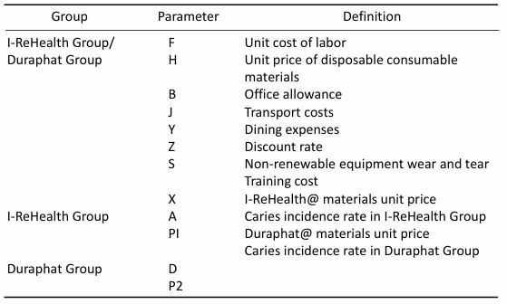 Dental caries, as a chronic non-communicable disease, has become a major global public health problem, affecting human oral health. The prevalence of dental caries among young children in Guangxi is particularly severe. The Fourth National Epidemiological Survey of Oral Health shows that the prevalence of dental caries in deciduous teeth among children aged 3-5 years in Guangxi is as high as 72.3%, which is nearly 10 percentage points higher than the national average for the same age group (62.5%). Dental caries not only causes health problems such as pain and chewing dysfunction, but its treatment costs also place a heavy economic burden on families and society. Among many preventive measures, topical application of fluoride varnish is recommended by the World Health Organization (WHO) as the preferred intervention for community prevention and control of dental caries in children because of its high concentration of fluoride (22,600 ppm) acting directly on the tooth surface, its simple operation, and its safety and effectiveness. With the deepening of China's new medical reform policy, medical institutions urgently need to consider both cost-effectiveness and prevention and control efficiency in the use of consumables. This policy orientation makes the search for fluoride varnishwith significant anti-caries effecacy and excellent cost performance an urgent need in the current public health field. In recent years, breakthroughs in R&D of domestically produced fluorinated coatings (such as I-ReHealth@) have provided new options for community caries prevention programs. Their price advantage makes them a potential alternative to traditional imported products (such as Duraphate@). However, the lack of systematic effectiveness comparisons and economic evaluations may lead to improper allocation of public health resources, thereby affecting the effectiveness of dental prevention among the population. Currently, there is a significant gap in comparative studies of different fluorinated coatings both domestically and internationally: on the one hand, existing studies mostly focus on comparing the clinical efficacy verification and cost-benefit assessment of single-brand fluorine-coatings with and without intervention; on the other hand, the few relevant studies in China have not yet established a complete cost-effectiveness analysis framework. This study innovatively adopts a community intervention trial design to comparatively analyze the caries preventiive effects and costs of I-ReHealth@'s fluoride varnish, which is widely used in Guangxi, and the classic product Duraphat@. It provides a scientific basis for selecting the optimal cavity prevention intervention plans for regional children's dental caries prevention, optimizing the allocation of public health resources, and formulating material procurement strategies that are in line with the principle of cost-effectiveness. 1. Materials and Methods 1.1 Research subject Eight kindergartens with similar geographical locations, dietary habits and educational conditions in Yizhou District, Hechi City, Guangxi Province were selected. Children aged 3 years old and their main caregivers from these kindergartens were chosen as the research subjects. Inclusion criteria: 1) The parents/ guardians of the children have given informed consent and are willing to participate in this study; 2) During the study, the children were willing to cooperate with the examinations. Exclusion criteria: 1) Children with a history of asthma or allergic to fluoride or rosin; 2) Children with a strong vomiting reflex; 3) Children with ulcerative gingivitis or herpes stomatitis. College & Hospital of Stomatology, Guangxi Medical University (approval number: 2023047) and the Clinical Research Ethics Committee of The People's Hospital of Hechi (approval number: 2024-111-01), and was registered in the National Clinical Trial Center (registration number: ChiCTR2500099748). The study period was from March 2023 to September 2024. 1.2 Sample size and sampling method Sample size formula: In the formula, n: two groups of overall samples: Based on the previous research of the research group (the additional caries caused by the regular intervention of Doraphat@ was 2.86 ± 2.83) [10], combined with the non-inferiority threshold in the statistical textbook, it can be appropriately set as 1/5 to 1/2 of a standard deviation, and consulting with oral experts, the Δ value is set as 3/10 of the standard deviation of the additional caries caused by the regular intervention of dDoraphat@, therefore Δ = 0.849, σ = 2.83, δ = 0, k = 0.5, α = 0.025 (one-sided test level), β = 0.1. Substituting these values into the formula for calculation, considering a 10% sample loss rate, it is calculated that each group requires at least 260 people as the sample size. A two-stage random sampling method was adopted, and the hidden allocation method was used to randomly divide 8 kindergartens into the I-ReHealth group (experimental group) and the Duraphat group (control group). A single-blind design was implemented for 3-year-old children whose parents gave informed consent and met the inclusion criteria. A total of 664 children were included in the research sample, with 327 in the I-ReHealth group and 337 in the Duraphat group. 1.3 Intervention Through questionnaire surveys, information on the demographic and socio-economic indicators, dietary habits, and oral health behaviors of children was obtained from their primary caregivers. Three inspectors, who had received professional training, had Kappa values greater than 0.88 for the examinations of dental caries, enamel hypoplasia, and visible plaque. The experimental group used the I-ReHealth? fluoride varnish (Approval Number: 20202170057, produced by Chengdu I-ReHealth Medical Devices Co., Ltd., 10 grams per pack), whose main components are 5% sodium fluoride, ethanol, pine resin, gum arabic, white beeswax, frankincense extract, sodium saccharin, raspbe