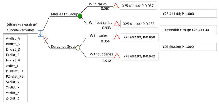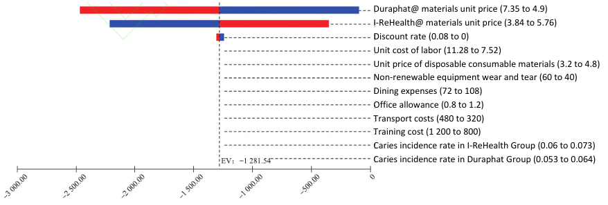 Note: △dmft represents the number of incremental cavities, lost teeth, and filled teeth. After baseline standardization, the total cost of the I-ReHealth group was 25,411.44 yuan, and that of the Duraphat group 26,692.98 yuan. The total cost of the I-ReHealth group was 1,281.54 yuan less than that of the Duraphat group. The specific model after standardization is shown in Figure 2. The cost minimization analysis of the decision tree model indicated that Airecon was the economically preferred option (Figure 3). The single-factor sensitivity analysis shows that the materials of Duraphat@ and I-ReHealth@ have the greatest impact on the results, while the effects of other factors are very small (Figure 4). When these two factors fluctuate within the given range, the total cost of the I-ReHealth group is always lower than that of the Duraphat group, and the outcome is robust (Figures 5 and 6).