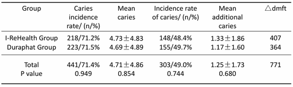 2.2 Pre- and post-intervention caries status After the intervention, there were no statistically significant differences in the caries incidence rate, mean caries number, the incidence rate of caries, and mean additional caries number between the two groups of children (P > 0.05) (Table 3). Tab 3 The caries prevalence, mean dmft, and incidence of new caries in the two groups after 1.5 years