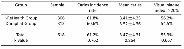 2. Results 2.1 Baseline condition At the baseline, a total of 664 children were included in the valid sample and completed the relevant questionnaires. For the individual questionnaires with incomplete responses, we made phone confirmations and made corrections. There were 664 valid questionnaires, and the response rate was 100.0%. There were no statistically significant differences in oral examination conditions, demographics, socioeconomics, dietary habits, and oral health behaviors between the two groups of children (P > 0.05). After 1.5 years of follow-up, a total of 618 individuals were reached (306 in the I-ReHealth group and 312 in the Duraphat group), with 46 individuals lost to follow-up. The loss-to-follow-up rates in the I-ReHealth group and the Duraphat group were 6.4% (21/327) and 7.4% (25/337) respectively, and the difference in loss-to-follow-up rates was not statistically significant (P > 0.05). The caries rates at baseline for the two groups were 61.8% and 60.6% respectively, with the mean number of decayed teeth being 3.41 ± 4.25 and 3.52 ± 4.36 respectively; there was no statistically significant difference in the caries rates, mean number of decayed teeth, and visible plaque index between the two groups of children (P > 0.05) (Table 2). No enamel hypoplasia was found in all the children. Tab 2 Comparison of baseline oral examination findings between the two groups of children