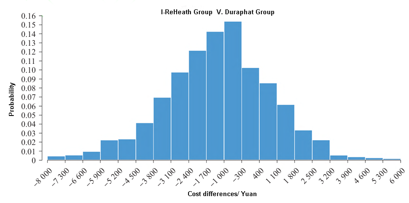 Fig 6 One-way sensitivity analysis of the unit price of Duraphat? material The probability sensitivity analysis shows that as the price of I-ReHealth@ increases, the probability of achieving economic benefits gradually decreases. When the price of i-rehealth@ is lower than 196 yuan, the probability of achieving economic benefits is greater than 70%. When the price of I-ReHealth@ is 245 yuan, the two curves intersect, and the probability of both types of fluoride varnishes being economically viable is 50% (Figure 7). Based on the parameter distribution, 1,000 Monte Carlo simulations were conducted. The results show that the probability of the total cost of the I-ReHealth group being lower than that of the Duraphat group is 73.1%, meaning that in most simulation scenarios, the cost performance of the I-ReHealth@ solution is superior to that of Duraphat@ (Figure 8).