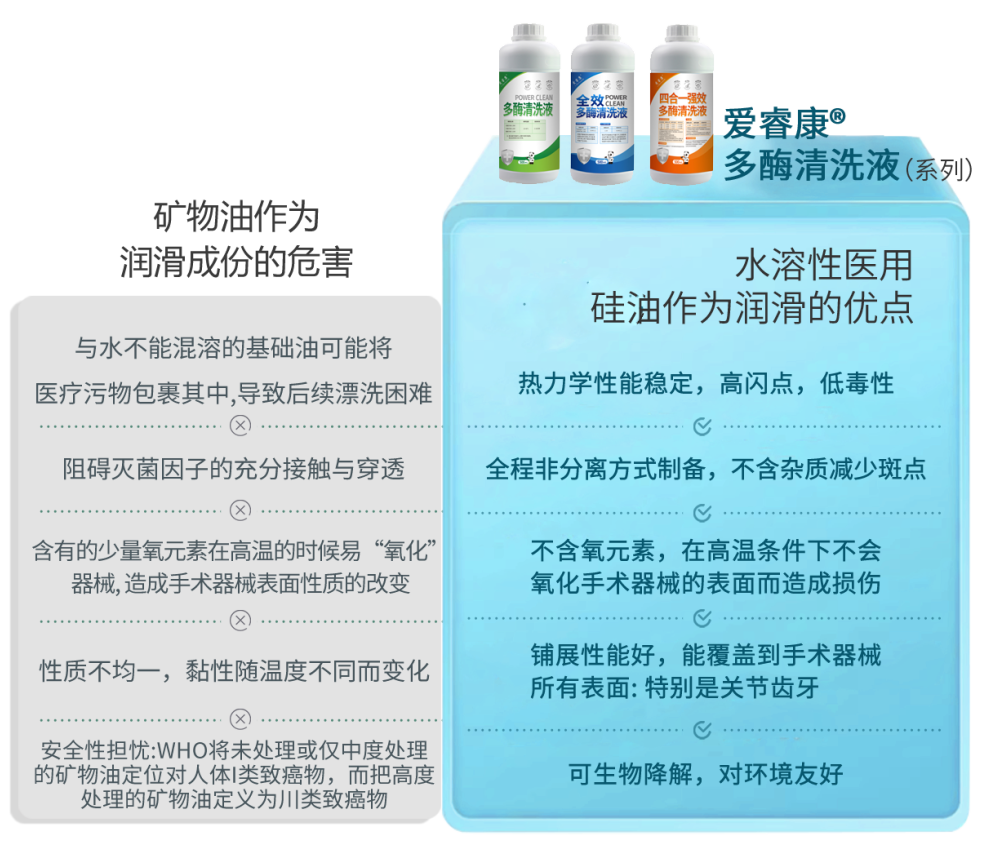 愛(ài)睿康醫(yī)療丨新品上市,器械消毒類產(chǎn)品 多酶清洗液、除銹劑、潤(rùn)滑劑等發(fā)表時(shí)間:2024-05-15 15:09 我國(guó)國(guó)民生產(chǎn)總值持續(xù)處于高速發(fā)展?fàn)顟B(tài),醫(yī)療器械相關(guān)技術(shù)同樣經(jīng)歷著日新月異的發(fā)展與進(jìn)步。在使用醫(yī)療器械時(shí),其清潔、消毒、滅菌情況對(duì)是否能夠充分發(fā)揮其作用影響巨大。使用清洗消毒不徹底、未完全滅菌的器械,可能導(dǎo)致患者傷口感染惡化,甚至造成死亡等極端現(xiàn)象。此那些具有危險(xiǎn)因子的污物與手術(shù)殘留物必須被清除,而清洗就是滅菌之前非常重要的一個(gè)步驟。 清洗操作通常包括沖洗、洗滌、漂洗、終末漂洗四個(gè)環(huán)節(jié),使用多酶清洗劑清洗是越來(lái)越廣泛。 ![]() 故建議使用醫(yī)用多酶清洗液進(jìn)行器械清洗。 新品-多酶清洗液系列 ![]() 愛(ài)睿康:多酶清洗液、全效多酶清洗液、四合一強(qiáng)效多酶清洗液 愛(ài)睿康醫(yī)用清洗劑系列