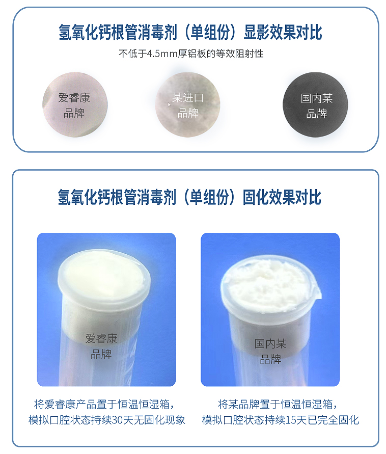 2、葡萄糖酸氯己定抑菌凝膠 ![]() ▲愛睿康?EDTA根管消毒潤滑凝膠 適用范圍:1.根管暫封消毒抑菌 2.根管慢性炎癥經(jīng)久不愈(尤其是化膿性炎癥)3.根管再次治療時(shí)首選封藥材料 ①完全抑制糞腸球菌生長,抑菌能力持久,對根尖周組織無毒性。 ②不損傷牙本質(zhì),避免牙本質(zhì)微硬度和粗度的下降,減少微滲漏的發(fā)生,牙體組織更安全。 ③抑制牙本質(zhì)膠原纖維的降解,保持牙本質(zhì)粘結(jié)力,減緩牙本質(zhì)與樹脂粘結(jié)力的下降,利于根管治療后修復(fù)的需要。 三、根管暫封材料 1、氫氧化鈣根管消毒糊劑(單組分) 推注型 ![]() ▲ 愛睿康? 氫氧化鈣根管消毒糊劑(單組分) 適用范圍:直接蓋髓、根管封藥、感染根管的臨時(shí)充填材料 ①水基質(zhì)預(yù)制糊劑,無需調(diào)拌,方便使用②PH≥12、優(yōu)良的抑菌能力 ③導(dǎo)入方便、清除容易 ④具X線阻射性 ⑤極高的生物相容性 ⑥不含酚類制劑,不影響樹脂及修復(fù)體聚合 ⑦有助于繼發(fā)性牙本質(zhì)的形成能 ⑧有效替代CP/FC ⑨臨床競品實(shí)驗(yàn)對比